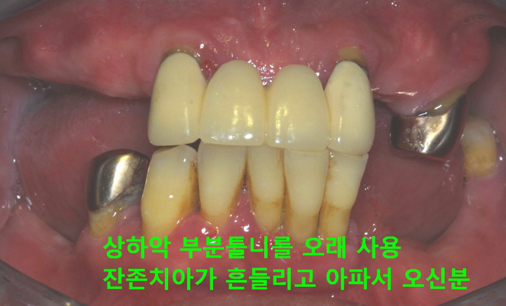 경제적인 비용 때문에 대부분은 틀니를 하게 됩니다.하지만 틀니를 해도 예전의 기능을 100% 회복하지는 못합니다. 완전 틀니의 경우 보통 10~30%의 기능만이 회복되며 잇몸 위에 얹어지는 구조물이므로 잇몸에 압박을 가하게 되며 이로 인해 잇몸이 부을 수도 있고 심하면 염증이 생기거나 상처가 생겨 곪을 수도 있습니다.