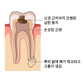 충치가 심해 치아 내부의 신경조직까지 충치가 진행된 경우