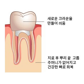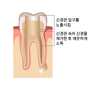 자연치아를 살리기 위한 최후의 치료법입니다.치아 내의 감염 조직과 혈관 등을 제거하고 깨끗이 소독한 후
