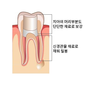치아 뿌리 내부를 특수한 재료로 밀봉 후 치아 머리의 빈 부분을 단단한 치과 재료로 꼼꼼하게 메워줍니다.
